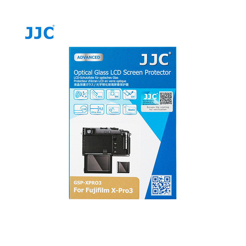 JJC GSP XPRO3 optical glass protective layer, 0.3 mm thick, for the LCD screen of the Fujifilm X Pro3 camera, effectively protects against dirt, scratches and UV rays, ensuring 95% light transmission for clear visibility.