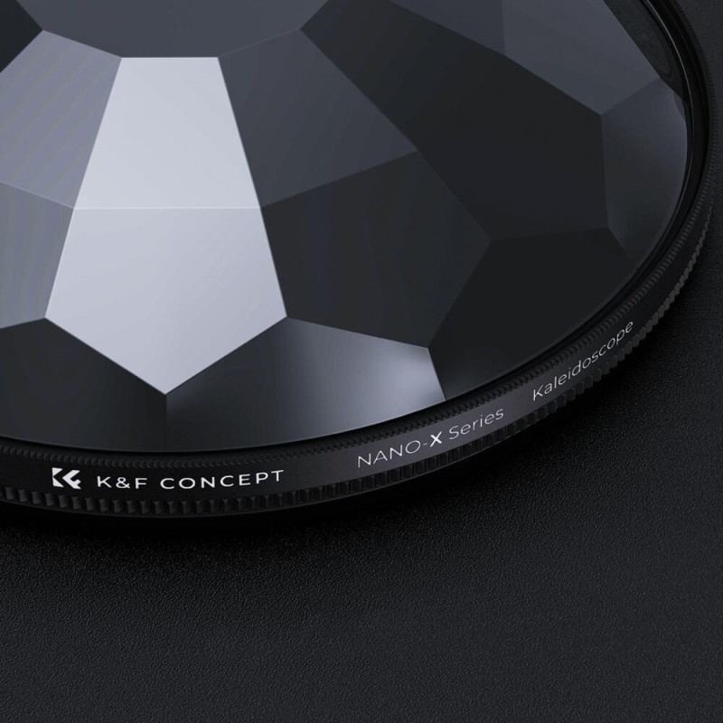 The KF Concept Nano-B Kaleidoscope Filter is a 72mm effect filter made of high-quality K9 optical glass. It features anti-reflective coatings, a rotating ring for effect adjustment, and a one-way threaded mount for easy attachment to lenses.