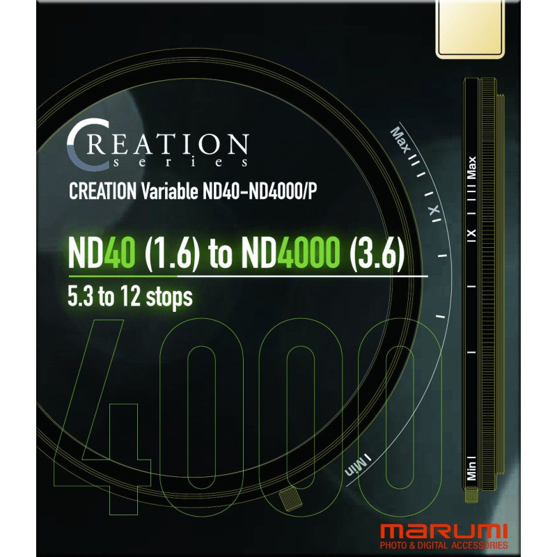 The Marumi Creation Vari-ND 40-4000 is a neutral density filter that allows you to smoothly adjust the amount of light entering the camera sensor, ensuring proper exposure and color balance. It has an antistatic, oleophobic and hydrophobic coating that makes it easy to clean and protects against dirt, fingerprints and water.