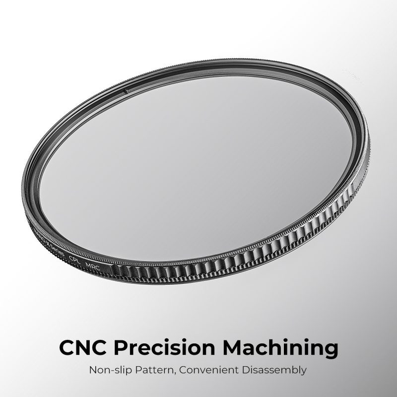 The KF Concept Nano-X CPL - 82mm model is designed for precision, with a dial for convenient adjustment of polarization levels and a non-slip ring texture for easy installation and adjustment. Its lightweight and durable aluminum alloy frame is extremely thin at only 5.5mm, preventing vignetting even when shooting with wide-angle lenses.