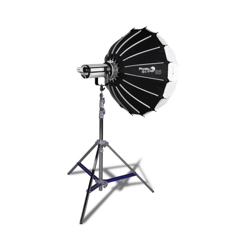 The Phottix G-Capsule Softbox 85cm features a sixteen-bar design and includes both internal and external diffusers. It is compatible with a variety of speed rings for different studio light mounts and provides soft, ambient lighting suitable for key or fill lighting.