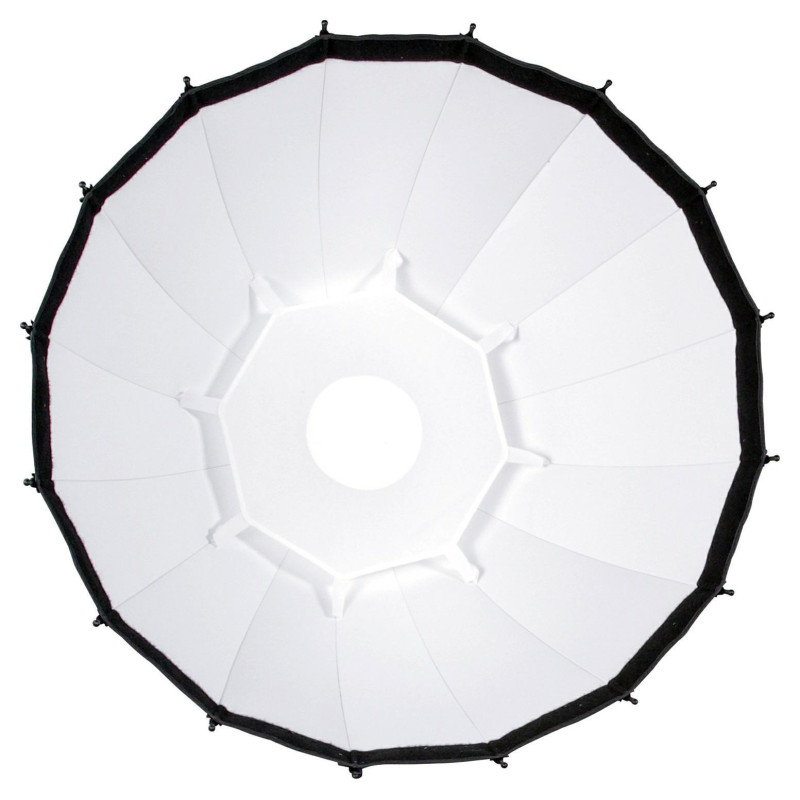The Phottix G-Capsule Deep Softbox 85cm is a versatile lighting modifier that functions as a softbox, beauty dish and lantern for use with a variety of lighting systems. It is made of heat-resistant material, has a magnetic gel filter holder and a unique "ONE Push Release" system for easy assembly and disassembly.