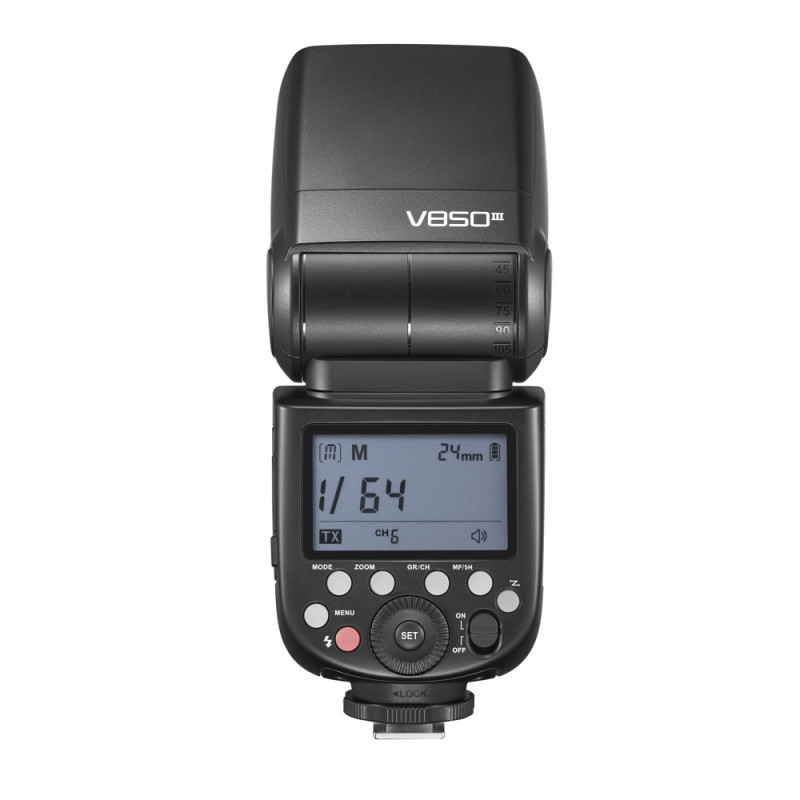 Godox Speedlite V850III is a portable flash unit designed for photography, featuring a GN~60 guide and a versatile bounce angle from 7º to 120º. It features an upgraded Li-ion battery for longer use, wireless functionality, and a remote control for easy settings.