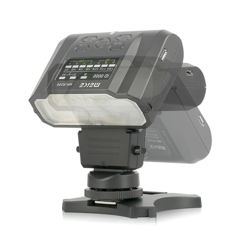 The Meike MK R200 II is a compact macro photography flash that works wirelessly with a transmitter. It has adjustable flash output, a convenient display, and is powered by two AAA batteries, as well as a micro USB port for charging.