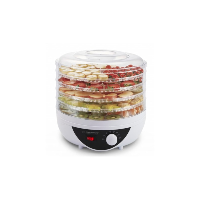 Esperanza EKD002 is a universal food dehydrator with an adjustable thermostat and 5 trays, designed for optimal drying of fruits, vegetables, herbs and other products.