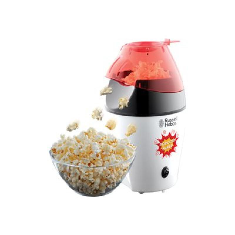The Russell Hobbs Fiesta Popcorn Maker uses hot air to quickly pop 35-50 grams of popcorn in under three minutes, without oil or fat. It features a removable measuring spoon for easy filling of popcorn kernels.