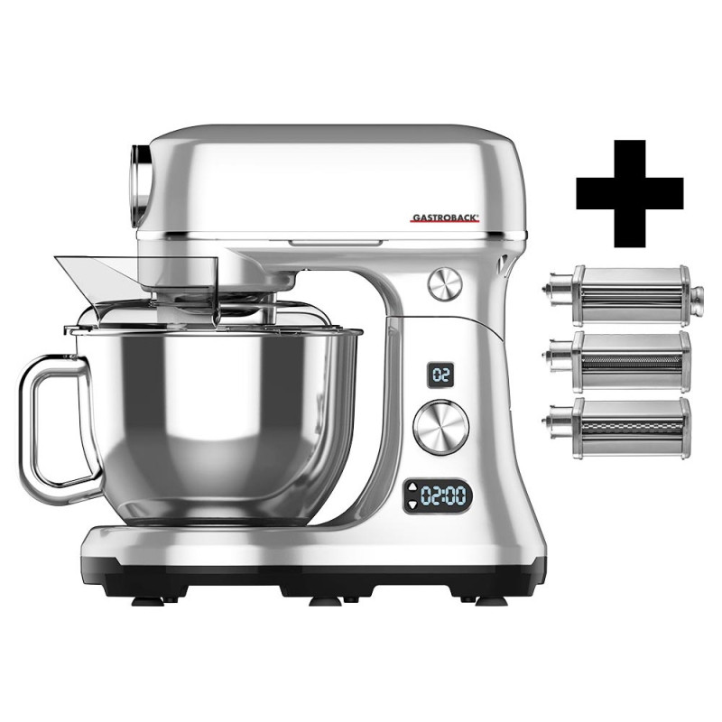 With included mincer attachment: 3 perforated discs (3mm / 5mm / 7mm), sausage filling attachment and biscuit attachment and four different pasta discs for home-made fettuccine, spaghetti, linguine and macaroni