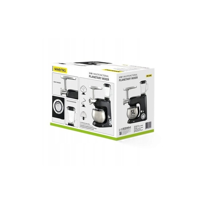 The 3-in-1 MR-559-M MAESTRO planetary mixer has a 5-liter stainless steel bowl and includes accessories for beating, kneading and mixing. It features a powerful 2000 W motor with six variable speeds and an integrated meat grinder.