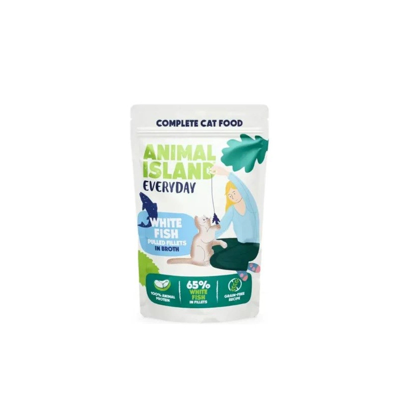 Wet cat food made with white fish in broth, suitable for adult cats of all breeds. It is grain-free, gluten-free and designed to support general health, skin and coat condition and muscle maintenance.
