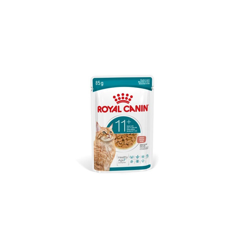 ROYAL CANIN Ageing 11+ Chunks in gravy is a complete wet cat food formulated for older cats, available in 12 x 85g pouches. It is free from soya, artificial colours and has a meat flavour to support overall health and vitality.