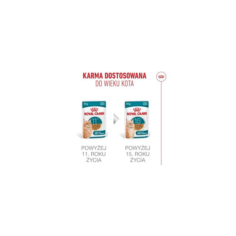 ROYAL CANIN Ageing 11+ Chunks in gravy is a complete wet cat food formulated for older cats, available in 12 packs of 85g. It is free from soya, artificial colours and has a meaty flavour to help support overall health and vitality.