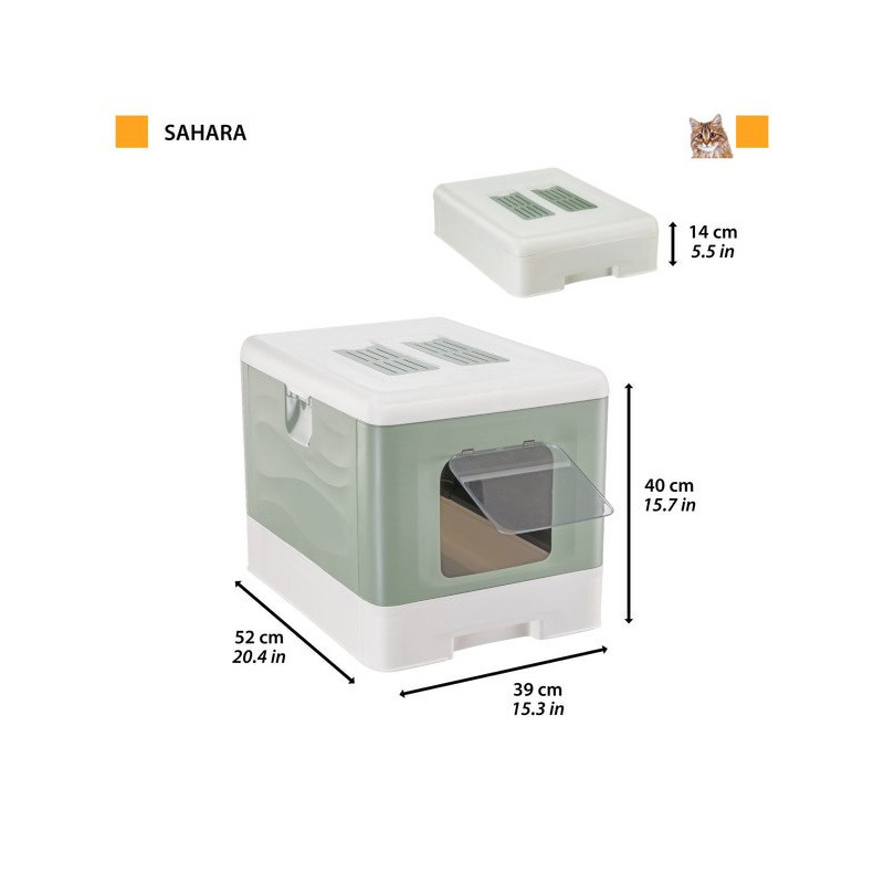 FERPLAST Sahara Green is a plastic cat litter box with a reversible door for easy access. Its dimensions are 52 cm deep, 39 cm wide and 40 cm high, and it weighs 1 kg.