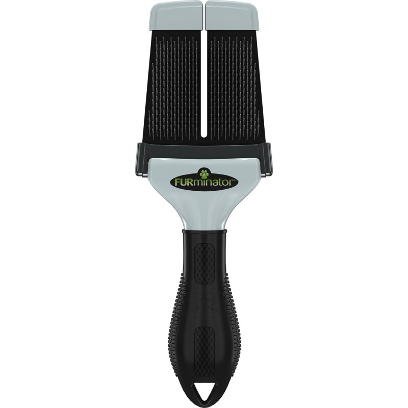 FURminator combs are designed for small dogs and cats with medium to long coats. Made of stainless steel and plastic, they effectively remove loose hair and tangles while being safe for pets.