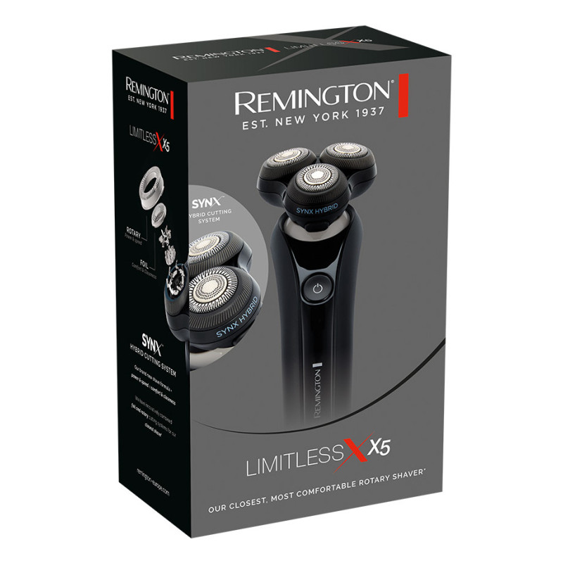 The REMINGTON LIMITLESS X5 SHAVER has a waterproof design and a built-in rechargeable battery that lasts for 50 minutes after a 1.5-hour charge. It features a rotating shaving head, a trimmer blade and a cleaning brush for maintenance.
