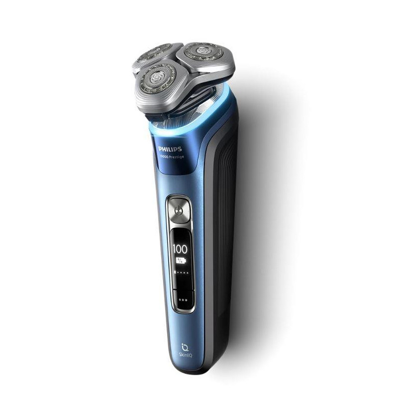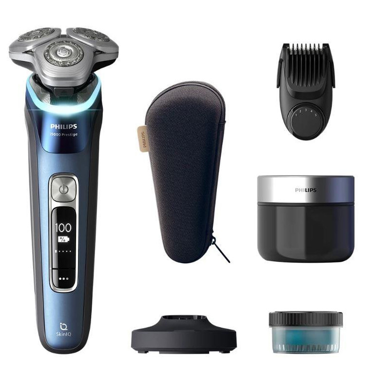The Philips i9000 Prestige with its triple action Lift&Cut shaving system and compact 360° Precision tilting head cuts hairs at skin level, even in hard-to-reach areas. SkinIQ technology with artificial intelligence senses, guides and adapts to intelligently care for skin comfort.