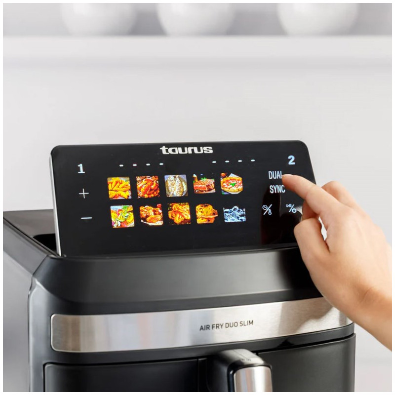 The Taurus Air Duo Slim is a hot air fryer with two baskets and a capacity of 13 liters. It has a touch control panel, 10 cooking programs and operates at a maximum temperature of 200 °C.