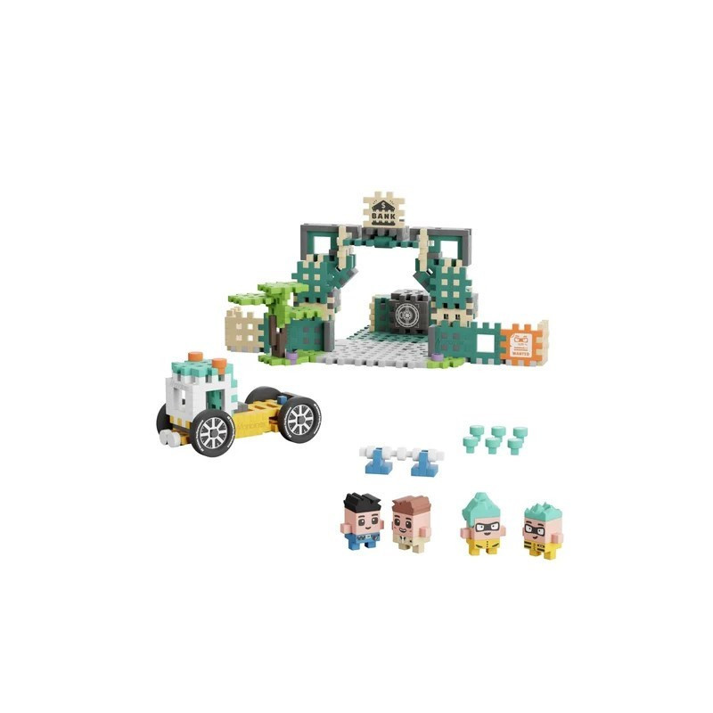 The MARIOINEX Mini Waffle City Bank Robbery construction set includes 148 colorful elements for children aged 6 and up. The package includes assembly instructions for creative play.