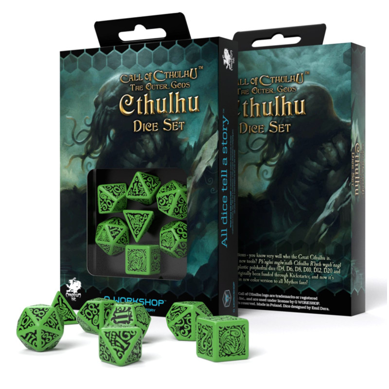 Cthulhu - The Great Old One. Legends say that he sleeps in a cyclopean city, waiting to return and regain control of the world! Ph'nglui mglw'nafh Cthulhu R'lyeh wgah'naglfhtagn! The rise of the Great Cthulhu will be THE END OF ALL. We can do nothing but accept and agree that the show must go on until the dramatic end, when the Star Horror destroys our reality. So let's play and rejoice. Role-playing games make it easier for us to imagine this end and prepare for it. Some friends of Q WORKSHOP, completely illegal therapists, deep-cover cultists, helped us create dice that allow players to immerse themselves in a doomed reality or give hope to those who pray for the defeat of Cthulhu. The green and black Call Of Cthulhu Outer Gods Cthulhu Dice Set (7), made of high-quality plastic, carved and painted with a blasphemous combination of ciphers and tentacles, is one of our greatest achievements in the transition to R'Lyeh. After the end of the world, we plan to move the business there and change the production profile to non-Euclidean dice for the Outer Gods.