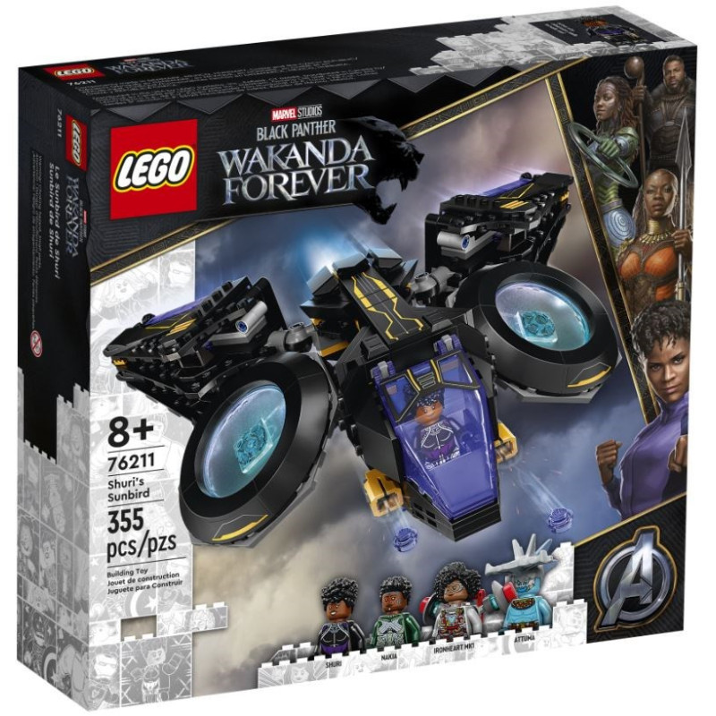 LEGO Super Heroes 76211 Shuri's Sunbird includes 355 pieces and features a detailed model of Shuri's plane. The set also includes minifigures depicting Shuri and other characters from the Marvel Universe.