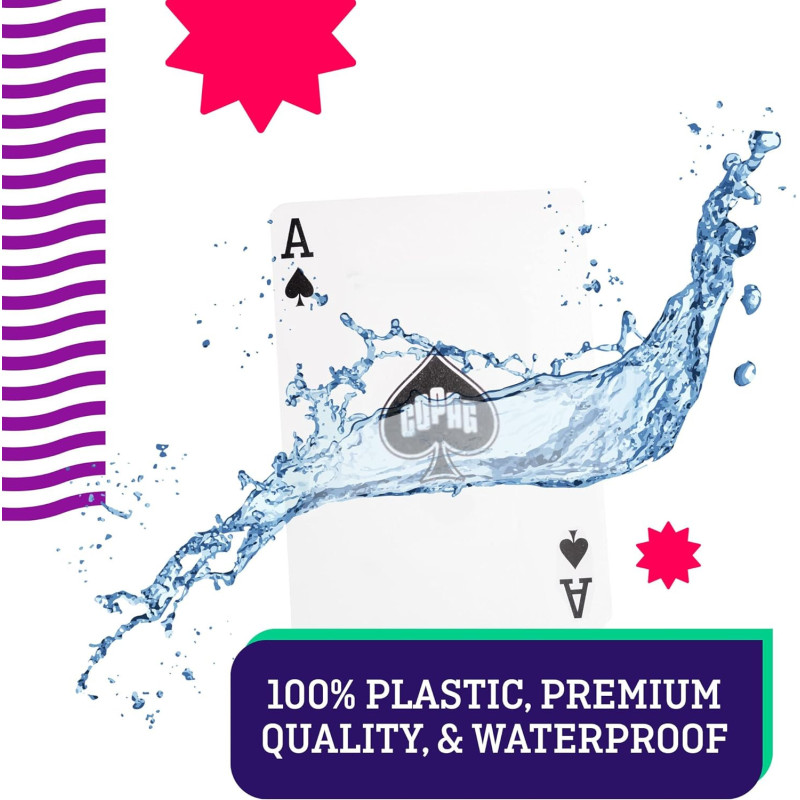 They are made of virtually indestructible PVC plastic and will last for years. The cards can be quickly wiped clean with a damp cloth, so they will not wear out over time. The decks of cards come with a hard plastic case for storage and carrying. Each deck consists of 52 cards, 2 Jokers and 1 COPAG card.