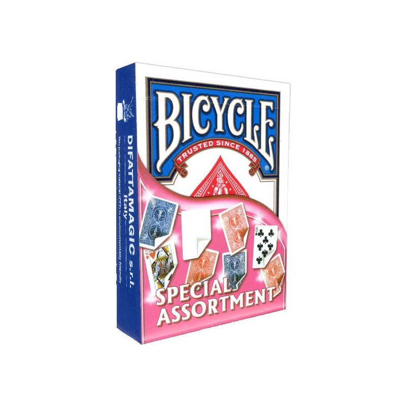The Bicycle Special Assortment deck includes 52 unique cards designed for magicians and card enthusiasts. The deck features a variety of card types, including double-sided, blank, and standard cards, all made from authentic Bicycle materials.