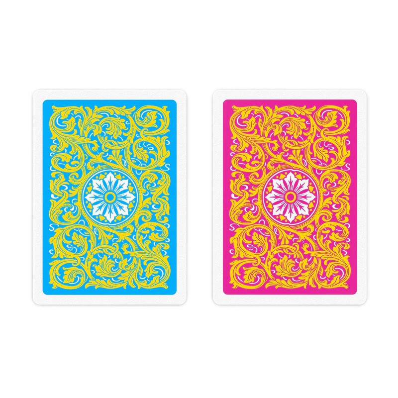 The set includes two decks of poker-sized Copag Jumbo Index playing cards with yellow, pink and blue backs. Each deck contains 55 cards, made of 100% PVC plastic, making them durable and washable.