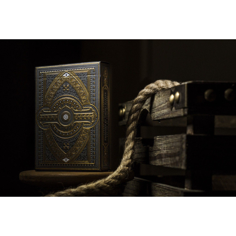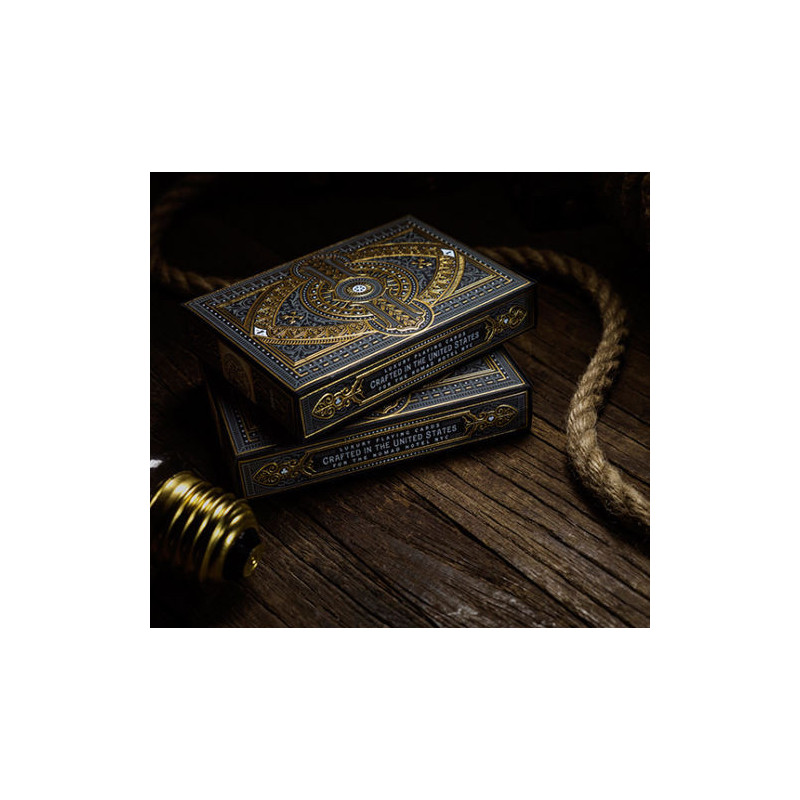 NoMad playing cards feature a unique gold-embossed design inspired by the architecture of the NoMad hotel. The deck contains 52 cards and 2 jokers, made from FSC-certified paper with a plastic coating, measuring 63.5 x 88.9 mm.