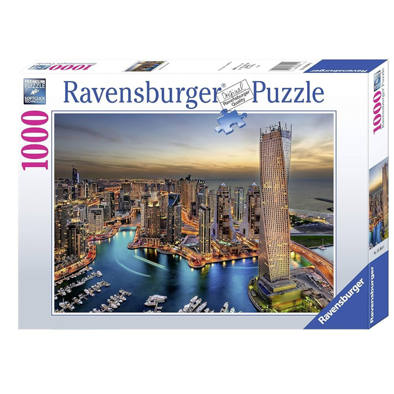 Ravensburger's puzzle 'Dubai Marina' depicts the iconic Dubai harbor in detail. Its dimensions are 360 x 26 x 50 mm and it is classified as a miscellaneous toy.