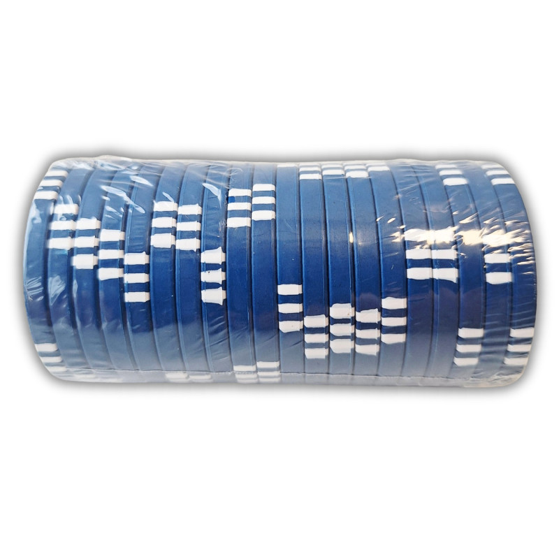20 high quality poker chips from Bicycle, weighing approximately 8 grams each and measuring approximately 3.8 cm in diameter. The set includes 20 chips in blue and white.