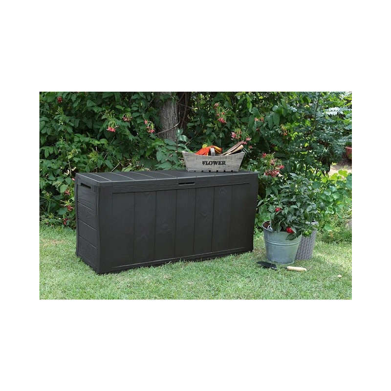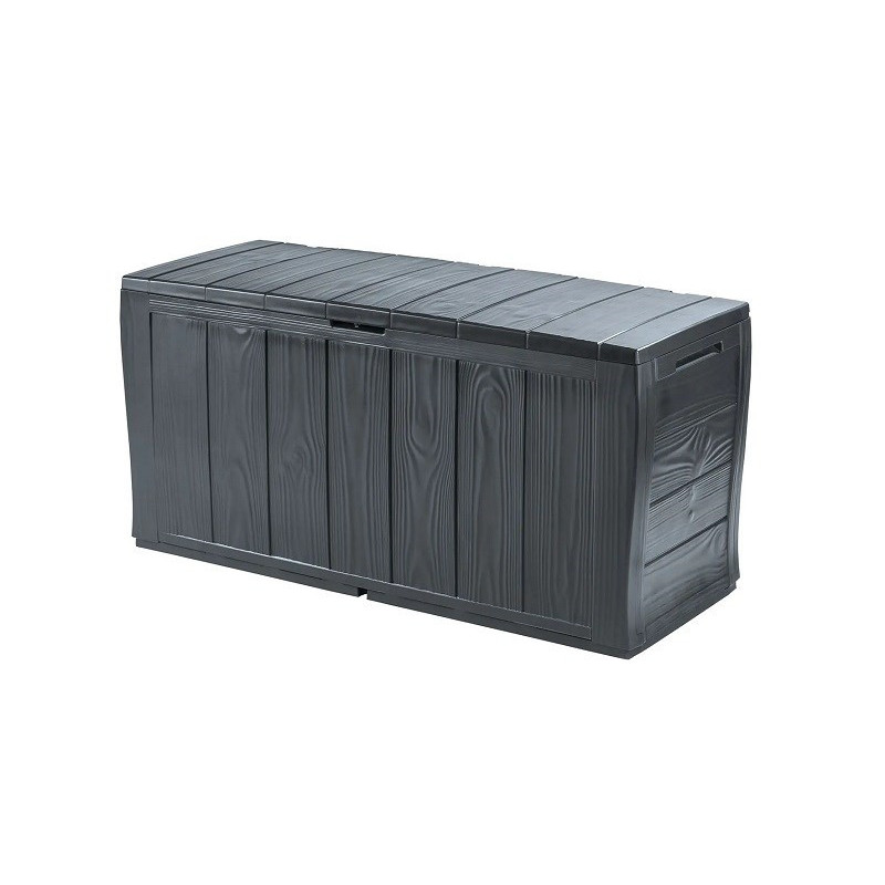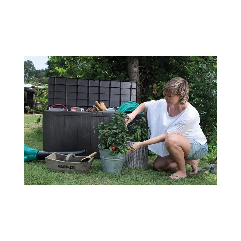 The KETER SHERWOOD 270L storage box has a capacity of 270 liters and is made of durable, weather-resistant materials. It has a lid, carrying handles and is perfect for a variety of outdoor spaces, such as patios and gardens.