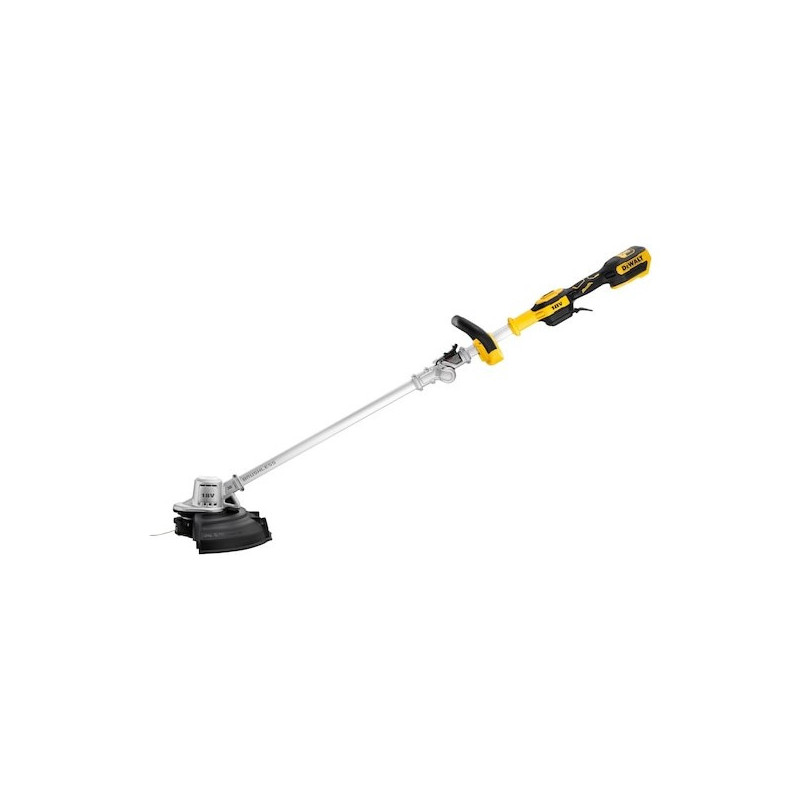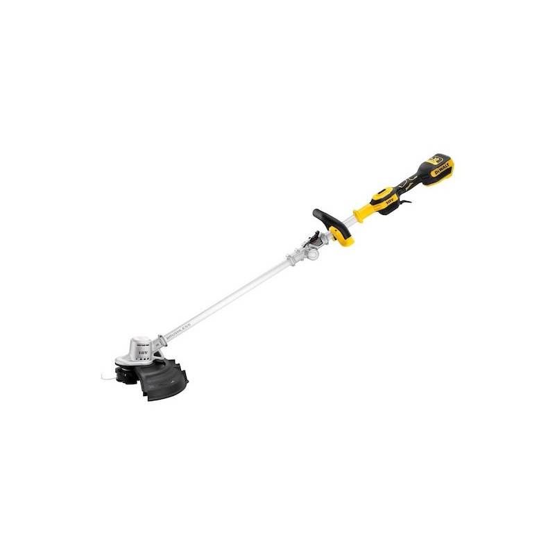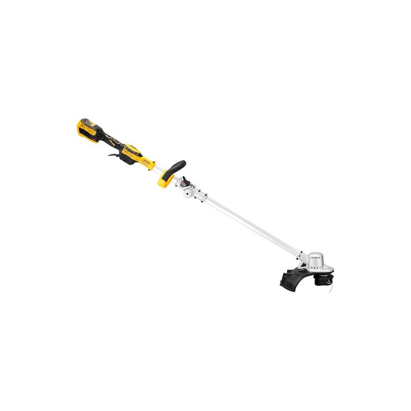 The DeWALT DCMST561N-XJ is a cordless trimmer with a cutting width of 35 cm and a maximum rotation speed of 6000 RPM. It has a D-shaped handle, a 2 mm line diameter and is powered by an 18 V battery with a capacity of 5 Ah.