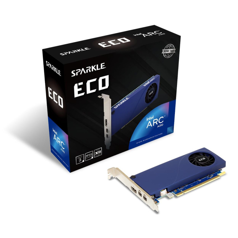 | Summary | Sparkle Technology Intel Arc A310 ECO. Graphics processor family: Intel, Graphics processor: Arc A310, Processor frequency: 1000 MHz. Discrete graphics card memory: 4 GB, Graphics card memory type: GDDR6, Memory bus: 64 bit. Maximum resolution: 7680 x 4320 pixels. DirectX version: 12 Ultimate, OpenGL version: 4.6. Interface type: PCI Express 4.0. Cooling type: Active, Number of fans: 1 fan(s) |