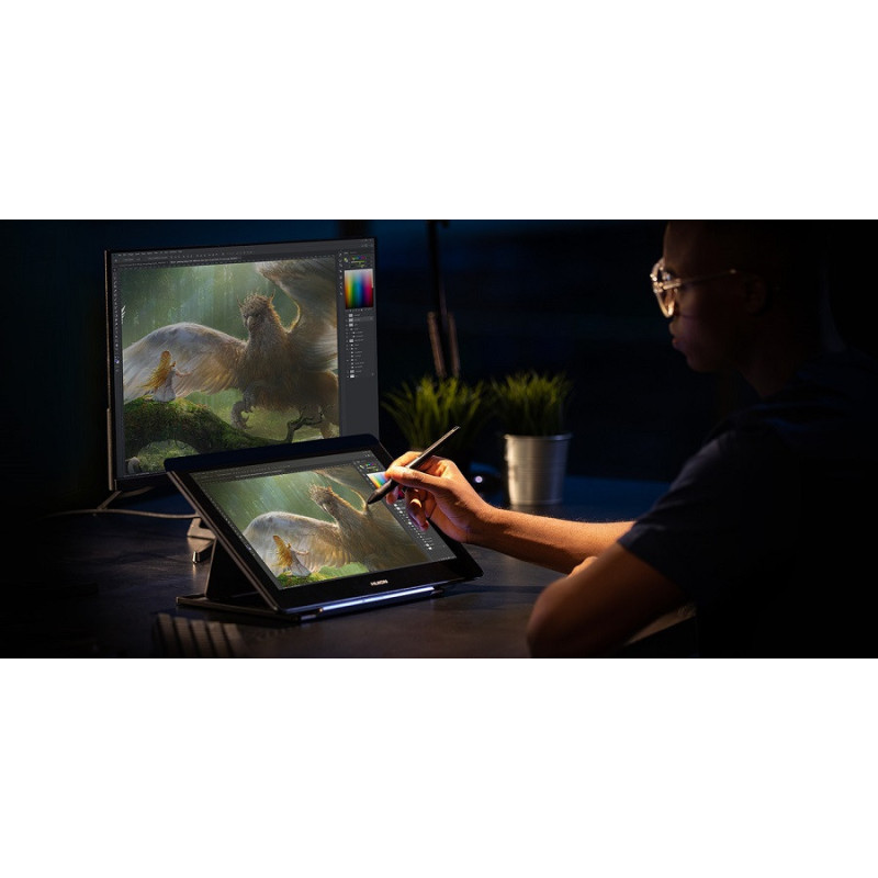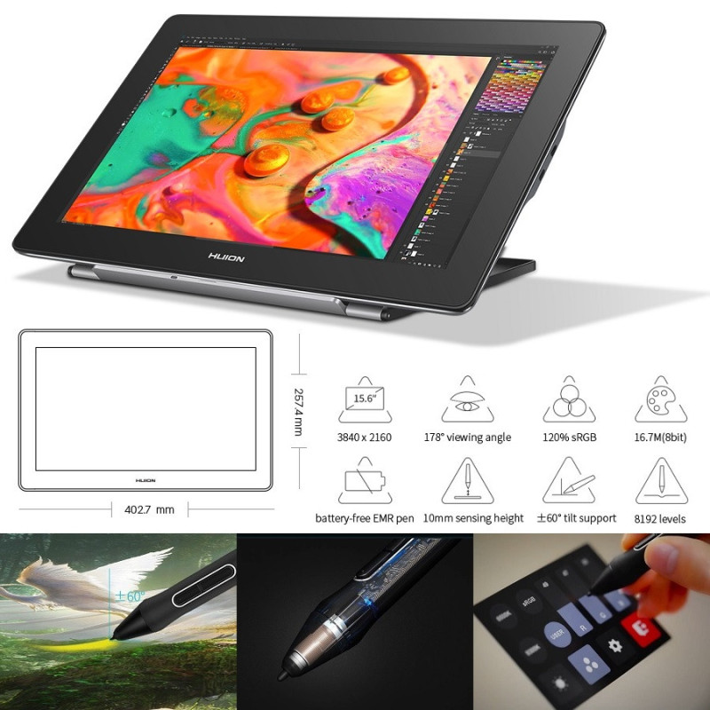 The HUION Kamvas Pro 16 (4K) features a 15.6-inch 4K UHD IPS display with a resolution of 3840 x 2160 pixels and 8192 levels of pressure sensitivity. It features a battery-free stylus, two USB Type-C ports for connectivity, and is compatible with a variety of operating systems.