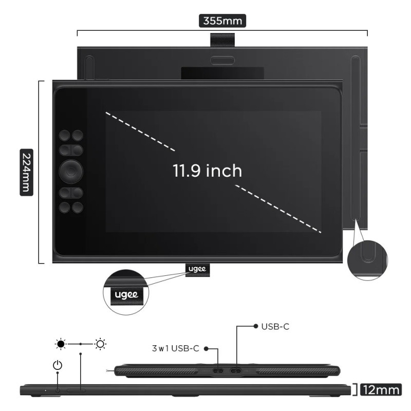 The Ugee UE12 PLUS features an 11.9-inch Full HD display with a resolution of 1920 x 1080 pixels and 147% sRGB color gamut. It features 8 customizable hotkeys, supports over 16,000 pressure levels, and is compatible with macOS, Windows, Android, Linux, and Chrome OS.