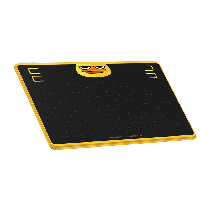 The Huion HS64 SE tablet catches the eye with a fun, charming design featuring an image of a cartoon duck and delicate star accents on the surface. With a slim design that is only 8 mm thick, the device can easily fit into a backpack or bag, making it an ideal choice for mobile workers or frequent travelers.