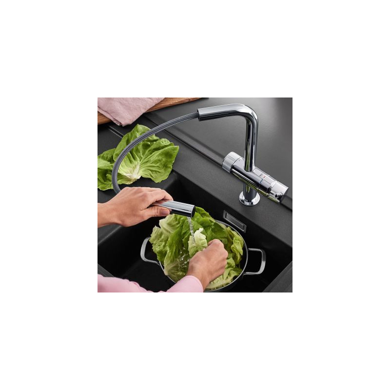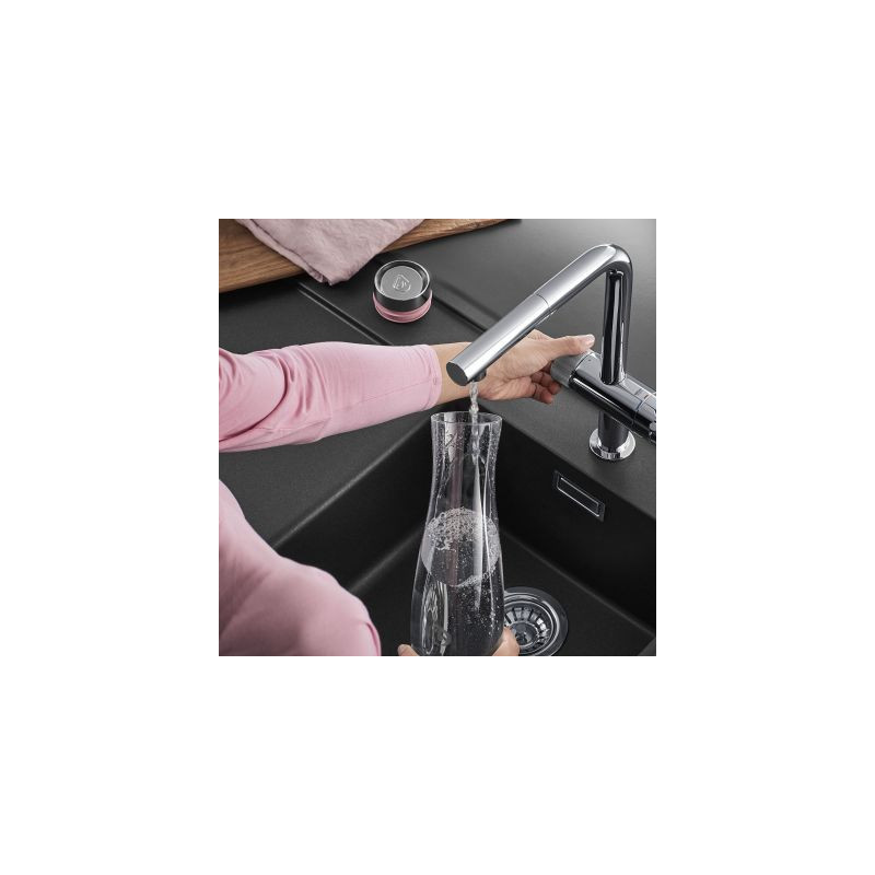 GROHE sink faucet with BWT filtration system. The faucet has two levers, one for filtered and one for unfiltered water. Filtered drinking water can be enriched with magnesium mineralization or simply purified from chlorine, bacteria and microplastics. This allows you to filter drinking water with BWT filter modifications MP200Magnesium, Protect, Care.