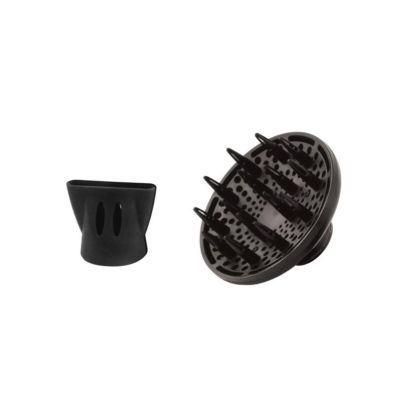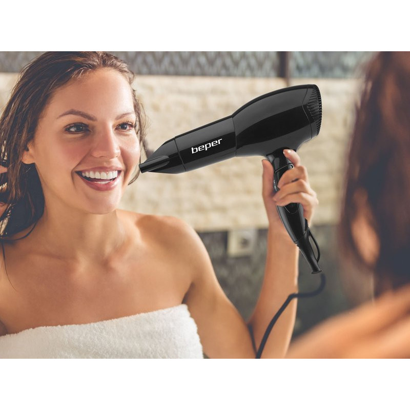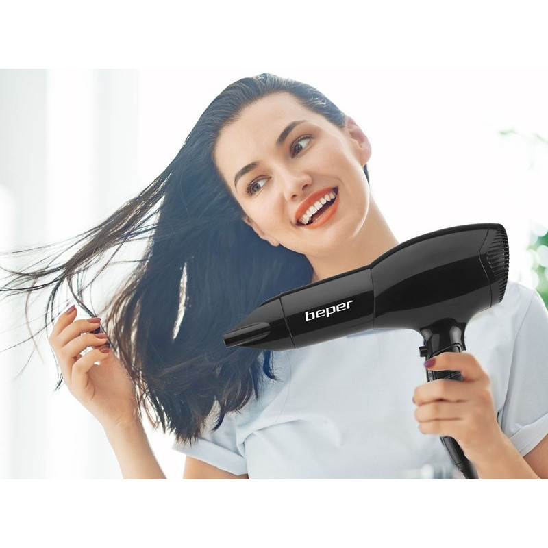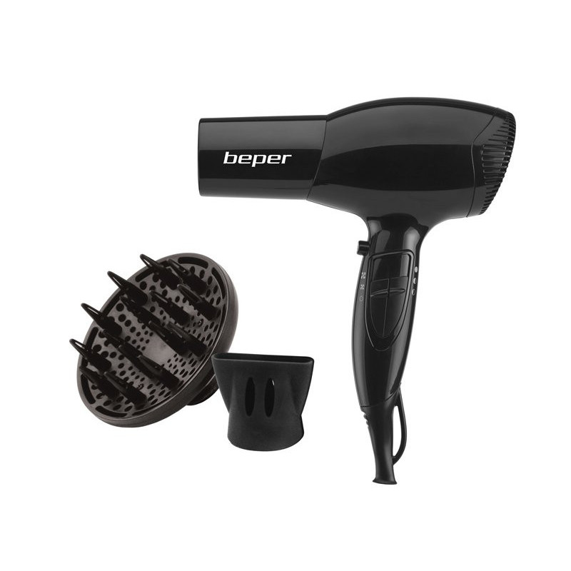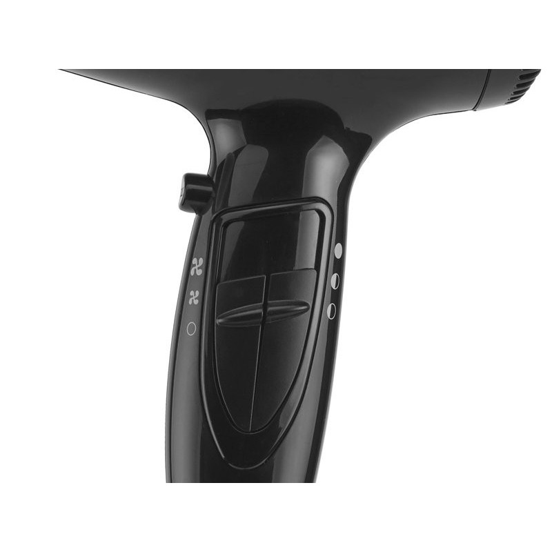 Light and handy hair dryer with non-slip rubberized handle. Two selectable speeds and three different temperatures. Equipped with cold air blow button and hanging hook. Equipped with air concentrator and diffuser.