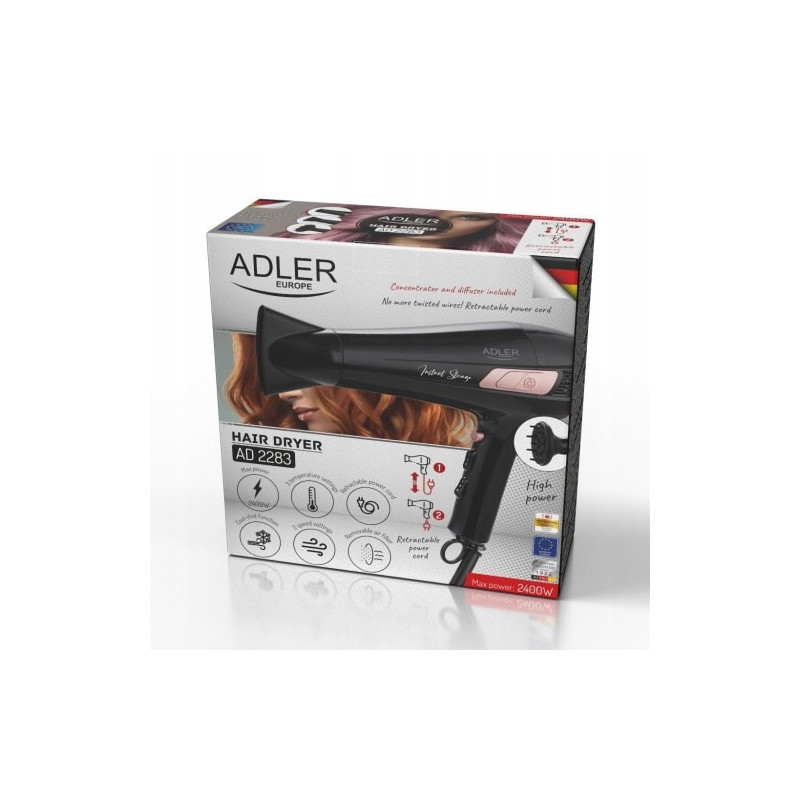 The Adler AD 2283 hair dryer has a power of 2000 W and comes with a cold air function and two speed settings. It has a 1.5 m long cord and overheating protection for safe use.