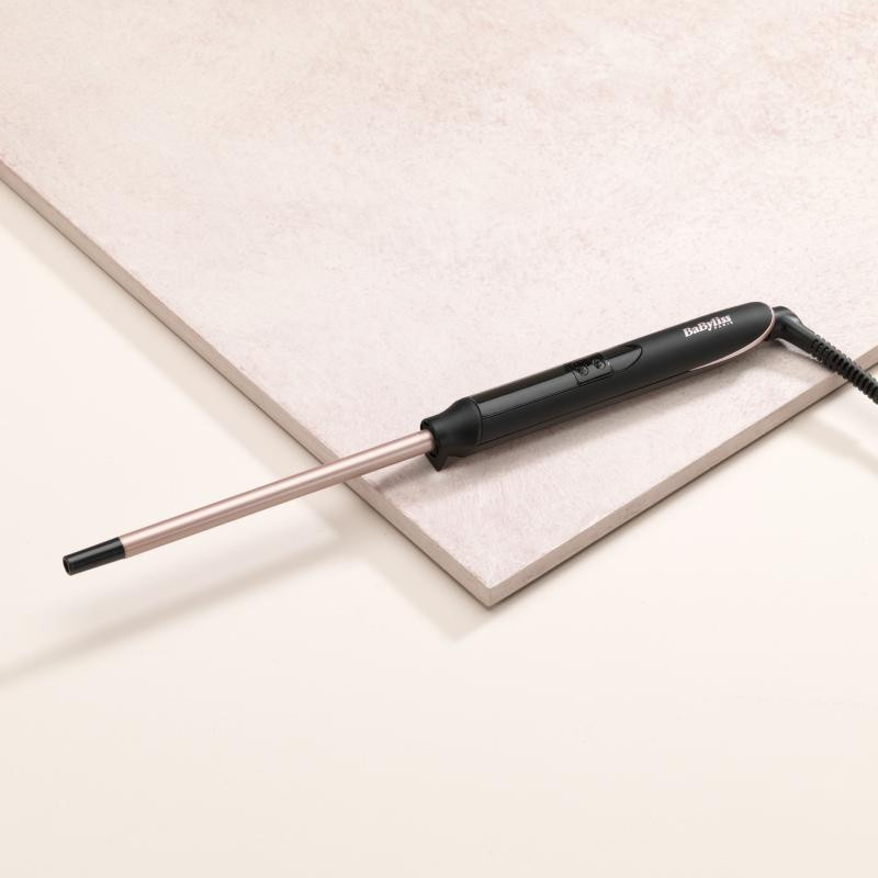 Super slim 10mm curling iron for fast and defined straight curls. Features a digital temperature display with 6 settings up to 210°C and a quartz-ceramic coating for even heat distribution.