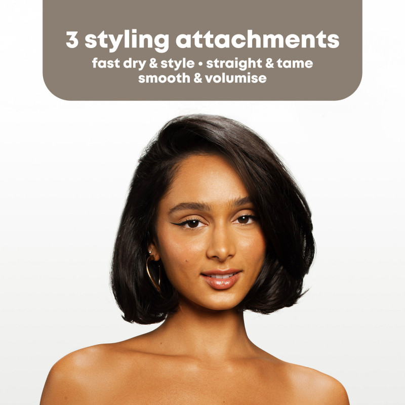 Three interchangeable styling attachments: Concentrator nozzle, Straightening & taming brush, Curved oval bristle brush