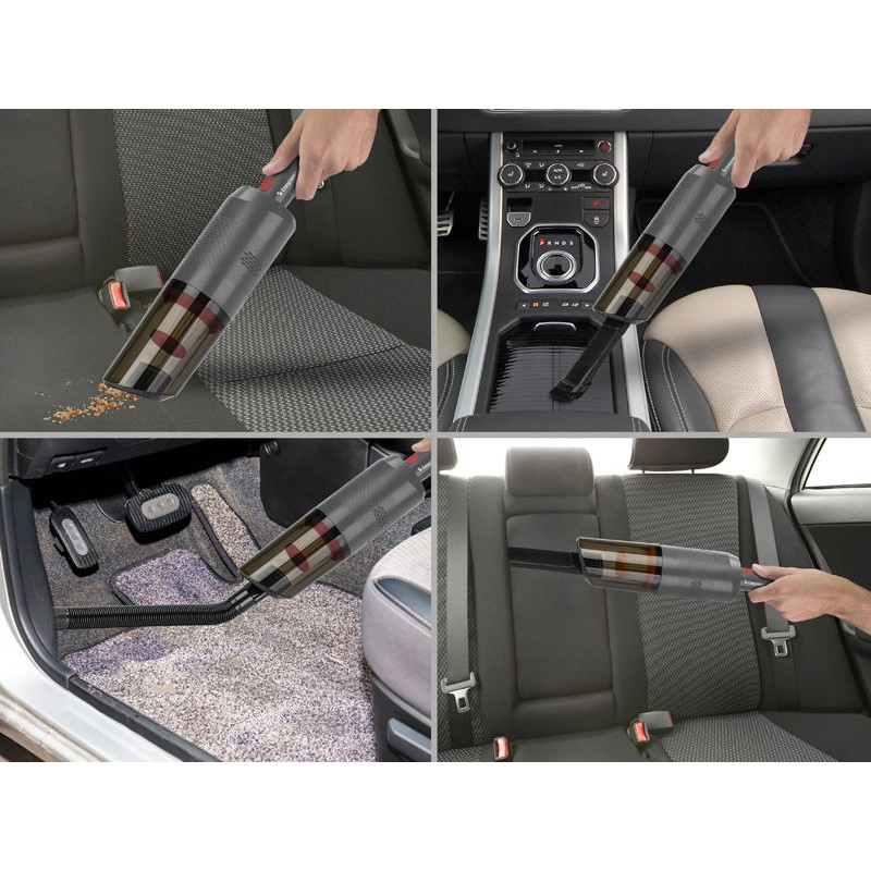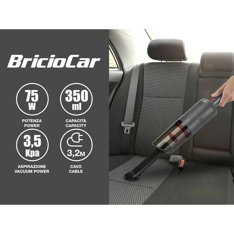 Practical hand-held hoover with car plug, ideal for vacuuming up all kinds of dry dirt inside the vehicle, thanks to the included accessories: hose, crevice lance and brush.
