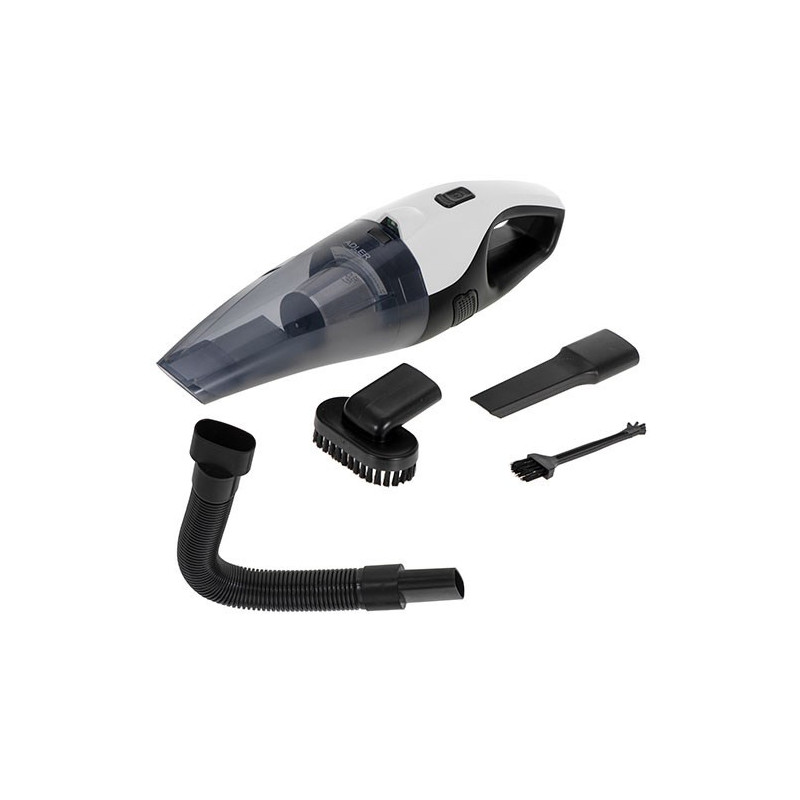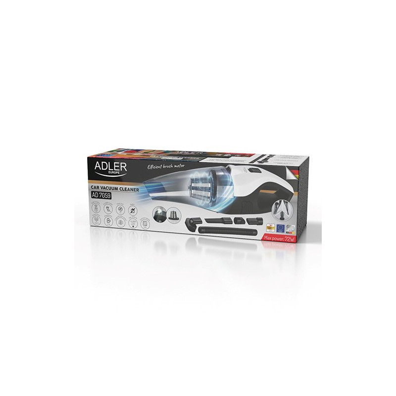 The ADLER AD 7059 car vacuum cleaner features a bagless design, a 0.45 L capacity and a suction power of 5500 Pa. It operates for up to 0.4 hours, charges in 3-4 hours and comes with a flexible hose, brush and crevice tool.