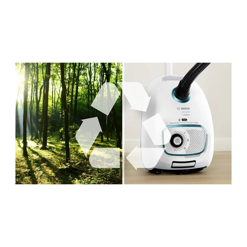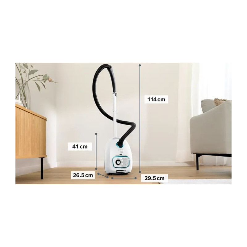 The Bosch Serie 4 BGB41HYG1H is a 600 W bagged vacuum cleaner with a 4 L dust capacity and a maximum operating radius of 11 m. It features variable electronic power control, a telescopic hose and various brush heads for different surfaces.