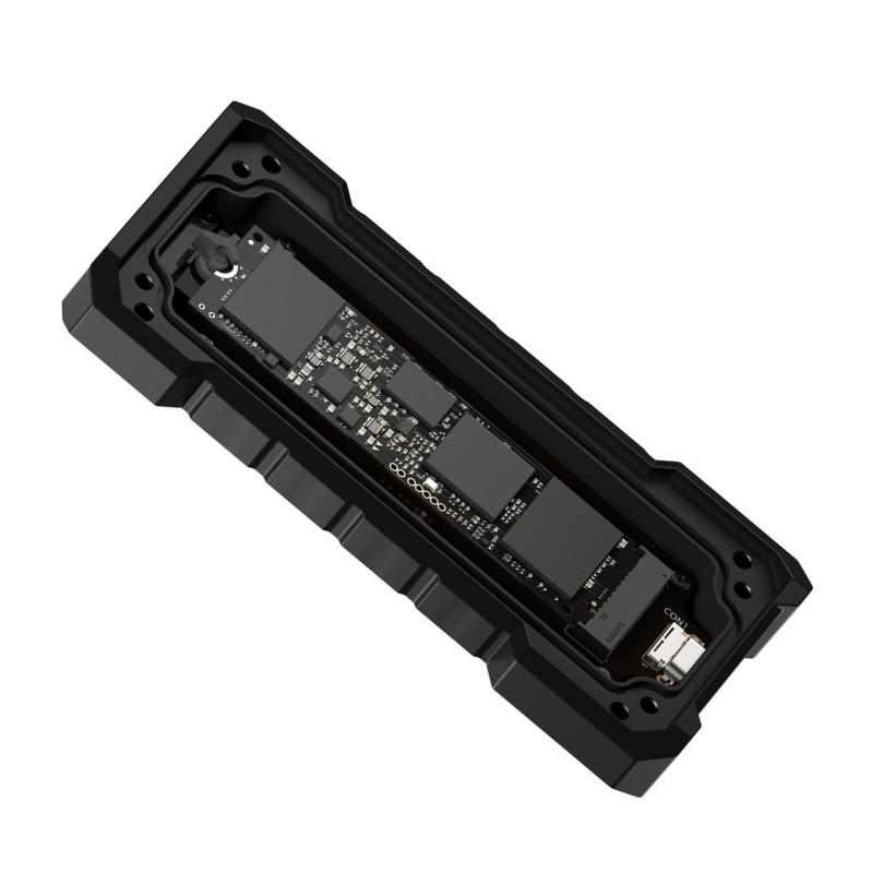 The ASUS TUF Gaming A2 SSD enclosure supports M.2 storage devices with a maximum capacity of 4TB and offers data transfer speeds of up to 20Gbit/s. It features an IP68-rated aluminum design for durability and protection against dust and water.