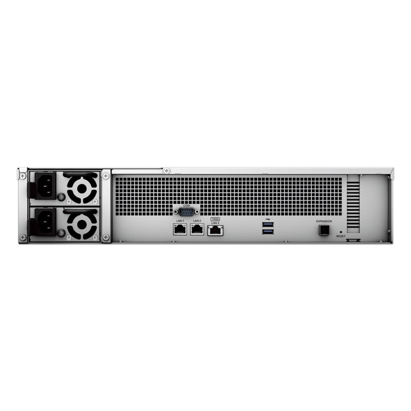 AMD Ryzen Embedded V1780B processor with 4 cores and 8 GB DDR4 memory. Supports up to 12 storage devices with RAID levels and has 3 Ethernet LAN ports for connectivity.