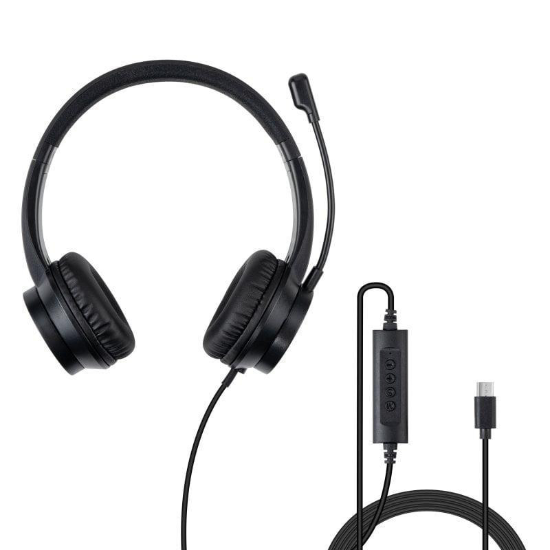 The USB Office Headset with USB-C Adapter offers professional-grade connectivity to PCs, laptops, and other devices with USB Type-C ports. Its binaural design delivers crisp stereo audio, effectively replacing built-in speakers on laptops or PCs. The flexible, omni-directional microphone ensures crystal-clear voice capture for superior audio clarity during video calls. Convenient in-line controls allow for quick adjustments to volume and muting, perfect for video conferencing flexibility. With its lightweight design, the headset provides all-day comfort, making it ideal for long hours in offices or call centers. It is also fully compatible with popular VoIP and office software.