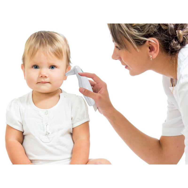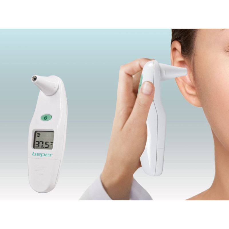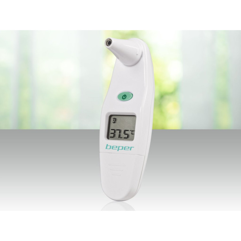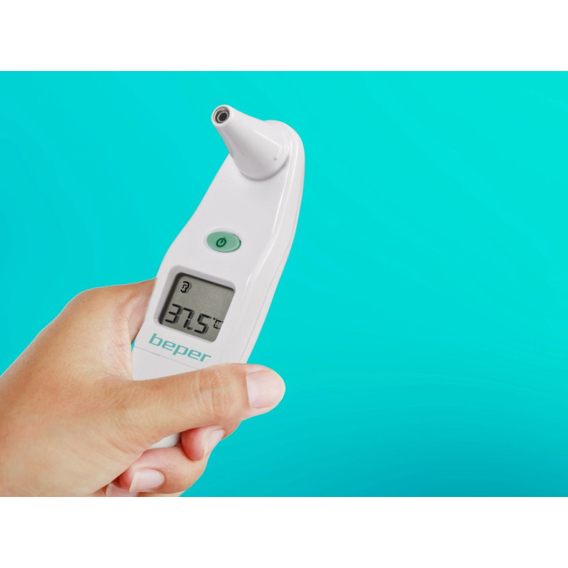 Digital thermometer for ear use with infrared technology. Equipped with an acoustic signal once it is ready for use and for temperatures > 37.8°C. Possibility to choose between °C and ºF. Temperature range from 32.0°C to 43.0°C. With liquid crystal display, 10 data memories and case. The package includes 15 hygienic plastic sensor covers and 1 battery.