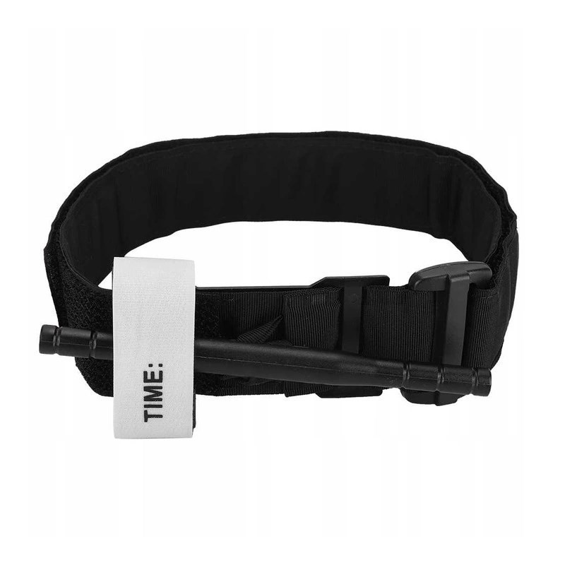 The HELBO Depan Staza tourniquet has an adhesive closure and is designed to be mounted on the wrist like a headband. In black, it also has safety warnings to keep away from fire and children.