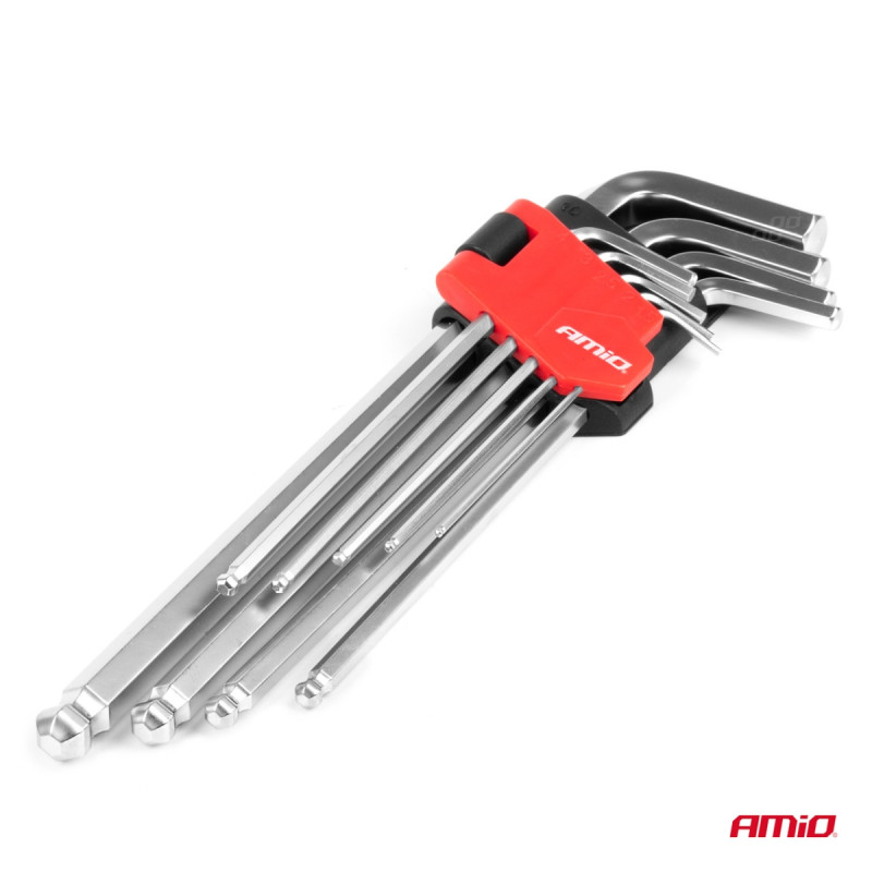 Enhance your workshop with a high-quality ball-end hex key set! This 9-piece set features extra length and is built from durable chrome vanadium (CRV) steel. Ideal for demanding tasks in tight spaces where precision and comfort are key.