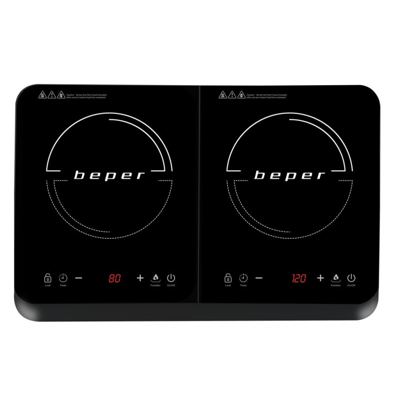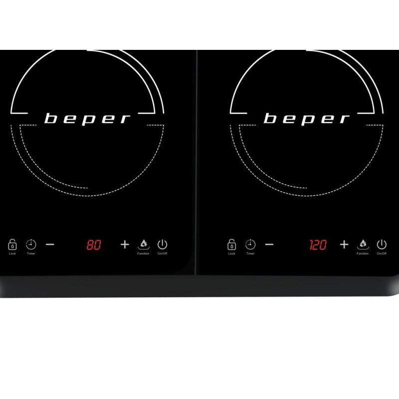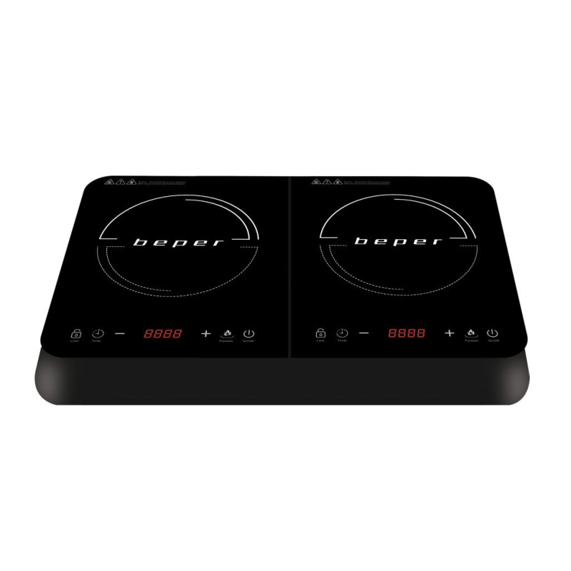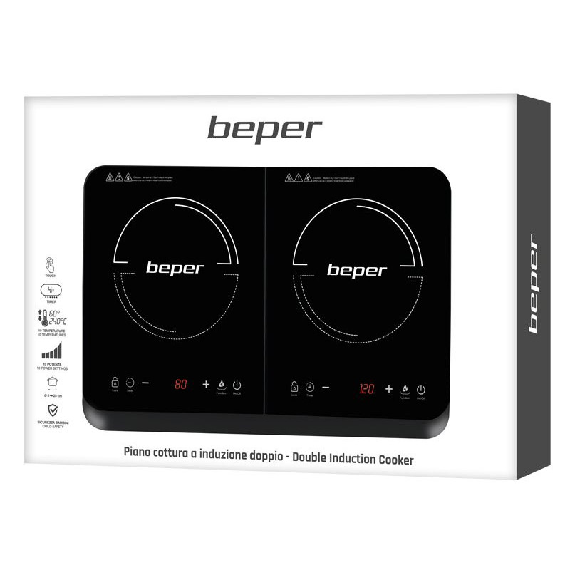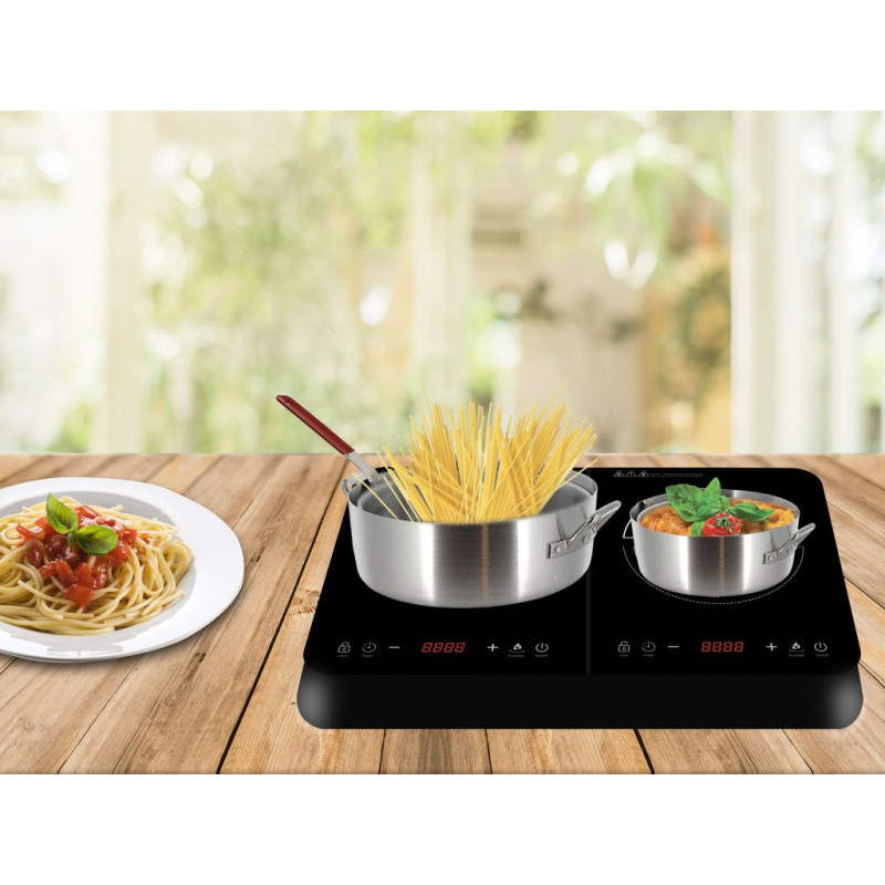 Double induction cooking top in scratch-resistant glass for 8 to 25cm diameter pans. Digital panel for each plate with button for selecting power, temperature and with programmable timer from 10 minutes to 4 hours. Practical and safe because it is activated only in the presence of the pan and the surface around the cooking area is cold to the touch. Equipped with a safety lock function, automatic switch-off and protection against overheating. Easy to clean.